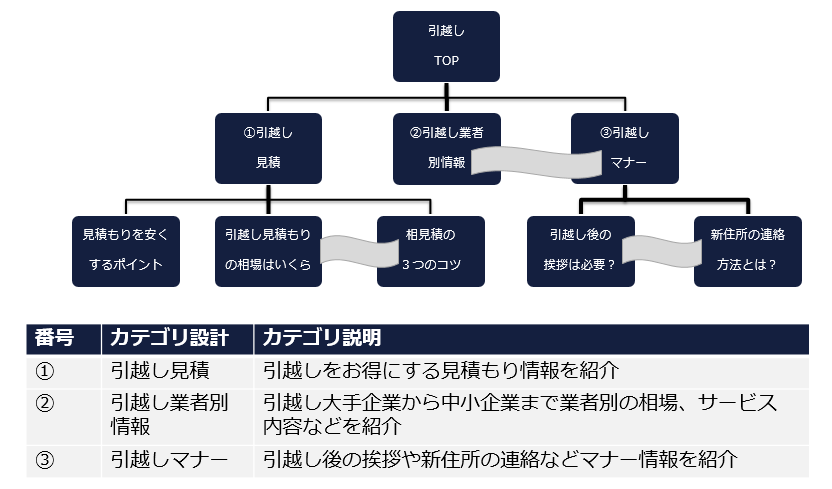 分析したキーワードからカテゴリー設定を行い、カテゴリ配下に関連するキーワードを割り当てます。カテゴリ構造だけでなく、前後記事も意識し、内部リンクだけでなく関連情報も強化します。
