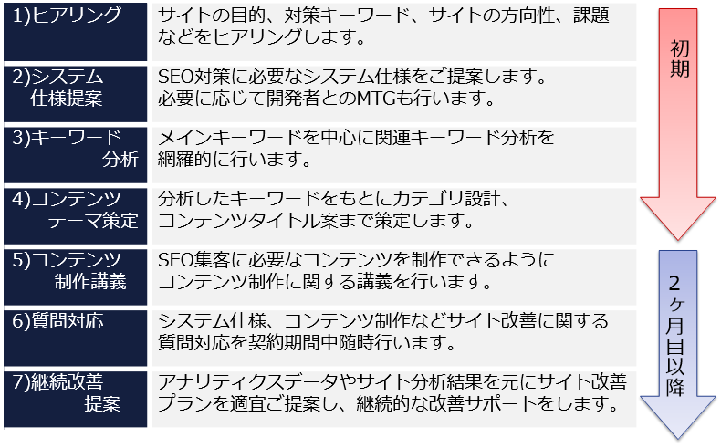 徹底した内部SEO対策を実現するため、御社開発者とシステム仕様に関する提案やMTGをコンサルティングの初期サービスに含んでおります。